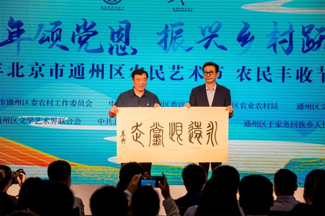 伴随着振奋人心、催人奋进的《盛世古韵》鼓点,通州区农民“两节”活动开幕式拉开帷幕。活动现场,沙画表演与书法家现场创作书法作品相结合的表演形式让观众耳目一新,书法家挥毫泼墨将创作的《永远跟党走》书法作品现场赠送给仇庄村党支部,随后,仇庄村党支部书记王书信致欢迎辞,并表示将以“两节”活动为契机,力争创造属于农民、农村的新时期文化阵地,努力让仇庄成为农村文化创新、乡村振兴的有益尝试和生动实践。