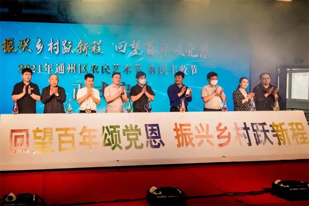 随后,多位领导手持金沙水晶杯登上启动台,将象征新时代乡村振兴发展活力与能量的金沙一起倾倒在启动台上。至此,通州区农民“两节”启动仪式正式开始。